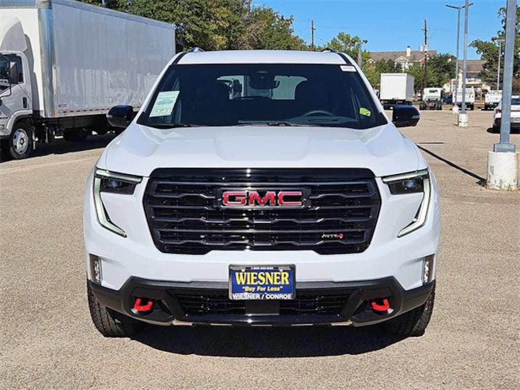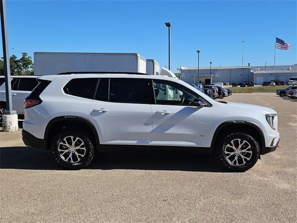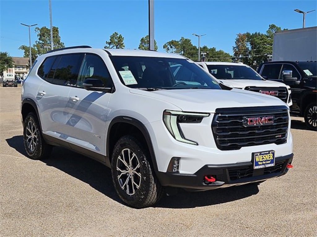 This 2026 GMC Acadia AT4 in Glacier White Tricoat comes with the following features: 2.5L DOHC 8-Speed Automatic AWD AWD and Forest Storm W/Mahogany A Floor Liner Package (LPO) (1st & 2nd Row All-Weather Floor Liner (LPO), 3rd Row All-Weather Floor Liner (LPO), and Integrated Cargo Liner (LPO)), Luxury Package (8 Diagonal Head-Up Display, Heated & Ventilated Driver & Front Passenger Seats, Heated Rear Outboard Seating Positions, Heated Wiper Park, and Laminated Acoustic Glass), Preferred Equipment Group 4SB, AWD, Forest Storm W/Mahogany A, 12 Speakers, 3.49 Final Drive Axle Ratio, 3rd row seats: split-bench, 4-Wheel Disc Brakes, 6-Way Power Front Passenger Seat Adjuster, 7-Passenger Seating (2-2-3 Seating Configuration), 8-Way Power Driver Seat Adjuster, ABS brakes, Air Conditioning, Alloy wheels, AM/FM radio: SiriusXM with 360L, Apple CarPlay/Android Auto, Auto High-beam Headlights, Auto-dimming Rear-View mirror, Automatic temperature control, Bodyside moldings, Bose Premium 12-Speaker System w/Sub-Woofer, Brake assist, Bumpers: body-color, Cloth/CoreTec Seat Trim, Compass, Delay-off headlights, Driver 2-Way Power Lumbar Seat Adjuster, Driver door bin, Driver vanity mirror, Dual front impact airbags, Dual front side impact airbags, Electronic Stability Control, Emergency communication system: OnStar Services capable, Exterior Parking Camera Rear, Four wheel independent suspension, Front anti-roll bar, Front Bucket Seats, Front Center Armrest, Front dual zone A/C, Front fog lights, Front Passenger Power Lumbar Seat Adjuster, Front reading lights, Fully automatic headlights, Garage door transmitter, Heated door mirrors, Heated Driver & Front Passenger Seats, Heated front seats, Heated steering wheel, Illuminated entry, Leather steering wheel, Low tire pressure warning, Navigation System, Occupant sensing airbag, Outside temperature display, Overhead airbag, Overhead console, Panic alarm, Passenger door bin, Passenger vanity mirror, Power door mirrors, Power driver seat, Power Liftgate, Power passenger seat, Power steering, Power windows, Radio data system, Radio: 15 Premium GMC Infotainment System, Rear air conditioning, Rear anti-roll bar, Rear reading lights, Rear side impact airbag, Rear window defroster, Rear window wiper, Remote keyless entry, Security system, SiriusXM w/360L, Speed control, Speed-sensing steering, Split folding rear seat, Spoiler, Sport steering wheel, Steering wheel mounted audio controls, Tachometer, Telescoping steering wheel, Tilt steering wheel, Traction control, Trip computer, Turn signal indicator mirrors, Variably intermittent wipers, Voltmeter, and Wheels: 18 x 8 Dark Machined Aluminum.