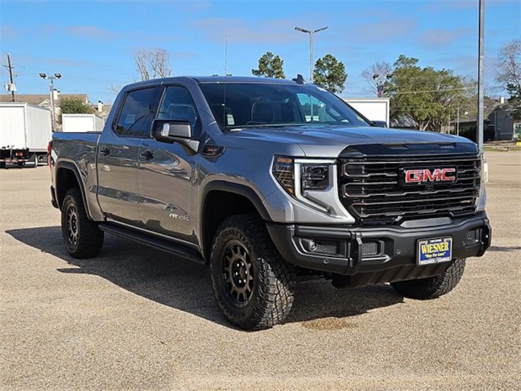This 2026 GMC Sierra 1500 AT4X in Sterling Metallic comes with the following features: EcoTec3 6.2L V8 10-Speed Automatic 4WD 10-Speed Automatic, 4WD, and Obsidian Rush Full Grain Leather AT4X AEV Edition (1st & 2nd Row AEV All-Weather Floor Liners (LPO), AEV Branded Front Head Restraints, AEV Stamped-Steel Rear Bumper, AEV Tailgate Decal with Exterior Badging, Gloss Black Door Handles, Rocker Protection, and Wheels: 18 x 8.5 12-Spoke High Gloss Black Aluminum), Preferred Equipment Group 4SG (120-Volt Bed Mounted Power Outlet, 120-Volt Interior Power Outlet, 2 Charge/Data USB Ports Inside Center Console, 2 Type-C Charge-Only Rear USB Ports, 2 USB Ports, Bed View Camera, Bose Premium Series with 12- Speaker System, Color-Keyed Carpeting Floor Covering, Deep-Tinted Glass, Driver-Selectable Full-Locking Front Differential, Driver-Selectable Full-Locking Rear Differential, Electric Rear-Window Defogger, Floor-Mounted Center Console, Front Premium Floor Liners with Removable Carpet Insert, Front Rain-Sensing Wipers, Gloss Black Header with Dark Nickel Grille Insert Bars, HD Surround Vision, Heated 2nd Row Outboard Seats, Heated Driver and Front Outboard Passenger Seating, Heavy-Duty Air Filter, Hill Descent Control, Hitch View, in-Vehicle Trailering System App, Integrated Trailer Brake Controller, Keyless Open and Start, LED Cargo Area Lighting, Multicolor 15 Diagonal Head-Up Display, MultiPro Tailgate Audio System by Kicker, Off-Road Suspension, OnStar Services Capable, Perimeter Lighting, Power Door Locks, Power Front Passenger Windows with Express Up/Down, Power Front Windows with Driver Express Up/Down, Power Rake and Telescoping Steering Column, Power Rear Windows with Express Down, Power Sliding Rear Window with Rear Defogger, Power Sunroof, Push Button Start, Rear Cross Traffic Braking, Rear Pedestrian Detection, Rear Premium Floor Liners with Removable Carpet Insert, Rear Wheelhouse Liners, Remote Vehicle Starter System, SiriusXM with 360L Trial Subscription, Spray-on Pickup Bedliner with GMC Logo, Steering Wheel Audio Controls, Theft Deterrent System (unauthorized Entry), Trailer Camera Provisions, Trailer Side Blind Zone Alert, Trailer Tire Pressure Monitor System, Ultrasonic Front and Rear Park Assist, Universal Home Remote, Ventilated Driver and Front Passenger Seats, Wi-Fi Hotspot Capable, and Wireless Charging), Trailering Package (Hitch Guidance), 10-Speed Automatic, 4WD, Obsidian Rush Full Grain Leather, 12 Speakers, 16-Way Power Driver Seat Adjuster with Lumbar, 16-Way Power Passenger Seat Adjuster with Lumbar, 220 Amp Alternator, 3.23 Rear Axle Ratio, 4-Wheel Disc Brakes, ABS brakes, Air Conditioning, Alloy wheels, AM/FM radio: SiriusXM with 360L, Apple CarPlay/Android Auto, Auto High-beam Headlights, Auto-dimming door mirrors, Auto-dimming Rear-View mirror, Automatic Emergency Braking, Automatic temperature control, Block heater, Brake assist, Buckle to Drive, Compass, Delay-off headlights, Driver door bin, Driver Memory, Driver vanity mirror, Dual Active Exhaust, Dual front impact airbags, Dual front side impact airbags, Electronic Stability Control, Emergency communication system: OnStar, Following Distance Indicator, Forward Collision Alert, Front anti-roll bar, Front Bucket Seats, Front Center Armrest, Front dual zone A/C, Front fog lights, Front Pedestrian Braking, Front reading lights, Front wheel independent suspension, Full Grain Leather Seat Trim, Fully automatic headlights, Garage door transmitter, Genuine wood dashboard insert, Genuine wood door panel insert, Heads-Up Display, Heated door mirrors, Heated front seats, Heated rear seats, Heated steering wheel, Illuminated entry, IntelliBeam Automatic High Beam on/Off, Lane Keep Assist with Lane Departure Warning, Leather steering wheel, Low Price includes: $1750 - Buick & GMC Consumer Cash Program. Exp. 03/31/2026