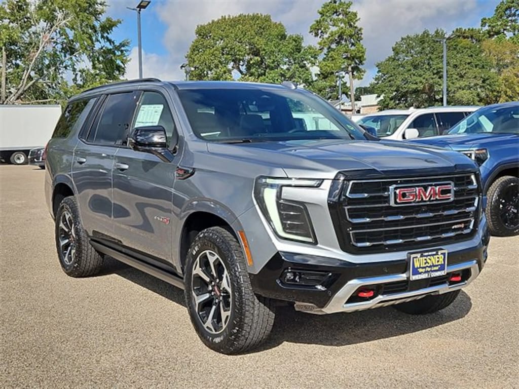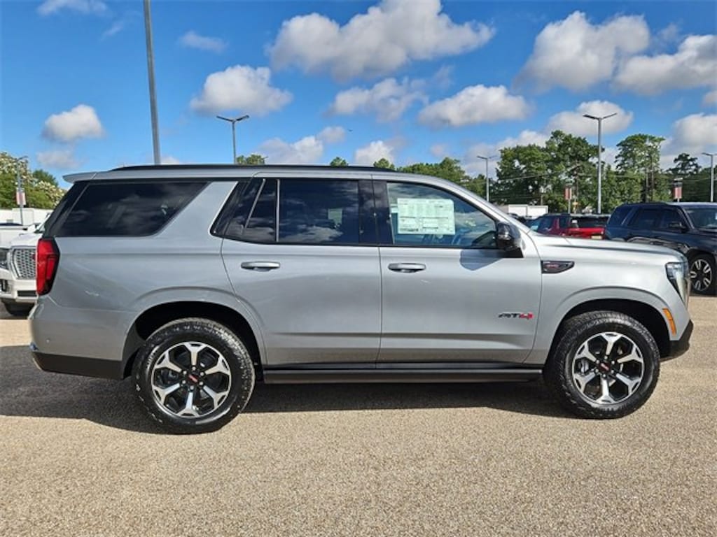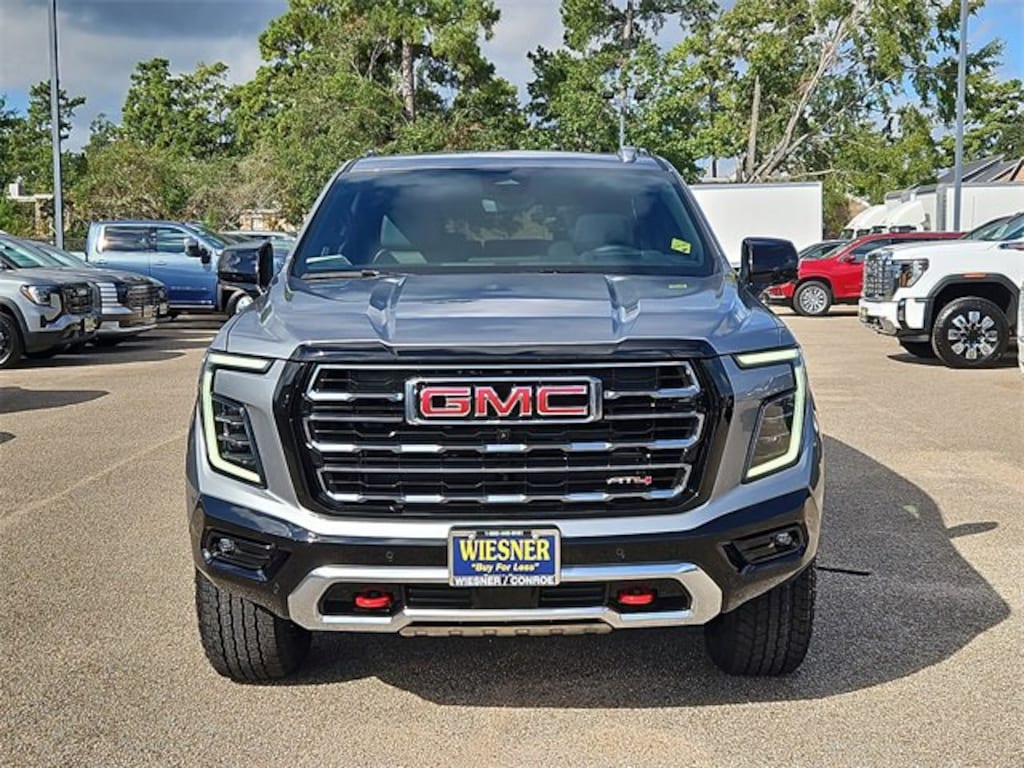 This 2026 GMC Yukon AT4 in Sterling Metallic comes with the following features: EcoTec3 6.2L V8 10-Speed Automatic with Overdrive 4WD 4WD Advanced Security Package (Glass Breakage Sensor, Theft-Deterrent Alarm System, Vehicle Inclination Sensor, and Vehicle Interior Movement Sensor), AT4 Premium Package (Dual-Pane Panoramic Power Sunroof and Power-Retractable Assist Steps), License Plate Front Mounting Package, Preferred Equipment Group 4SB (4-Way Power Driver Lumbar Seat Adjuster, 4-Way Power Front Passenger Lumbar Seat Adjuster, AutoSense Hands-Free Power Liftgate, Black Roof-Mounted Luggage Rack Side Rails, Body-Color Door Handles, Bright Front & Rear Door Sill Plates, Dual Exhaust System, Front High-Approach Angle Fascia, Heavy-Duty Air Filter, Hill Descent Control, Perforated Heated & Ventilated Dr & Frt Pass Seats, Power Tilt & Telescopic Steering Column, and Red Horizontal-Mounted Recovery Hooks), Technology Package (15 Diagonal Multi-Color Head-Up Display, Floor Console, Inside Rearview Auto-Dimming Rear Camera Mirror, and Power Release 2nd Row Bucket Seats), 4WD, 10 Speakers, 3.23 Rear Axle Ratio, 3rd row seats: split-bench, 4-Wheel Disc Brakes, ABS brakes, Adaptive suspension, Air Conditioning, Alloy wheels, AM/FM radio: SiriusXM with 360L, Apple CarPlay/Android Auto, Audio memory, Auto High-beam Headlights, Auto-dimming door mirrors, Auto-dimming Rear-View mirror, Auto-leveling suspension, Automatic temperature control, Bose 10-Speaker Surround w/CenterPoint, Brake assist, Bumpers: body-color, Compass, Delay-off headlights, Driver door bin, Driver vanity mirror, Dual front impact airbags, Dual front side impact airbags, Electronic Stability Control, Emergency communication system: OnStar and GMC connected services capable, Exterior Parking Camera Rear, Four wheel independent suspension, Front anti-roll bar, Front Bucket Seats, Front Center Armrest, Front dual zone A/C, Front fog lights, Front reading lights, Fully automatic headlights, Garage door transmitter, Heated door mirrors, Heated Driver & Front Passenger Seats, Heated front seats, Heated rear seats, Heated steering wheel, Illuminated entry, Low tire pressure warning, Magnetic Ride Control Suspension, Memory seat, Navigation system: GMC Connected Navigation, Occupant sensing airbag, Outside temperature display, Overhead airbag, Overhead console, Panic alarm, Passenger door bin, Passenger vanity mirror, Perforated Leather Seating Surfaces, Power door mirrors, Power driver seat, Power Liftgate, Power passenger seat, Power steering, Power windows, Radio: 16.8 Diagonal Premium GMC Infotainment Sys, Rain sensing wipers, Rear air conditioning, Rear anti-roll bar, Rear reading lights, Rear seat center armrest, Rear window defroster, Rear window wiper, Remote keyless entry, Security system, SiriusXM w/360L, Speed control, Speed-sensing steering, Split folding rear seat, Spoiler, Steering wheel memory, Steering wheel mounted audio controls, Tachometer, Telescoping steering wheel, Tilt steering wheel, Traction control, Trip computer, Turn signal indicator mirrors, Variably intermittent wipers, Ventilated front seats, Voltmeter, and Wheels: 20 x 9 Machined & Painted.