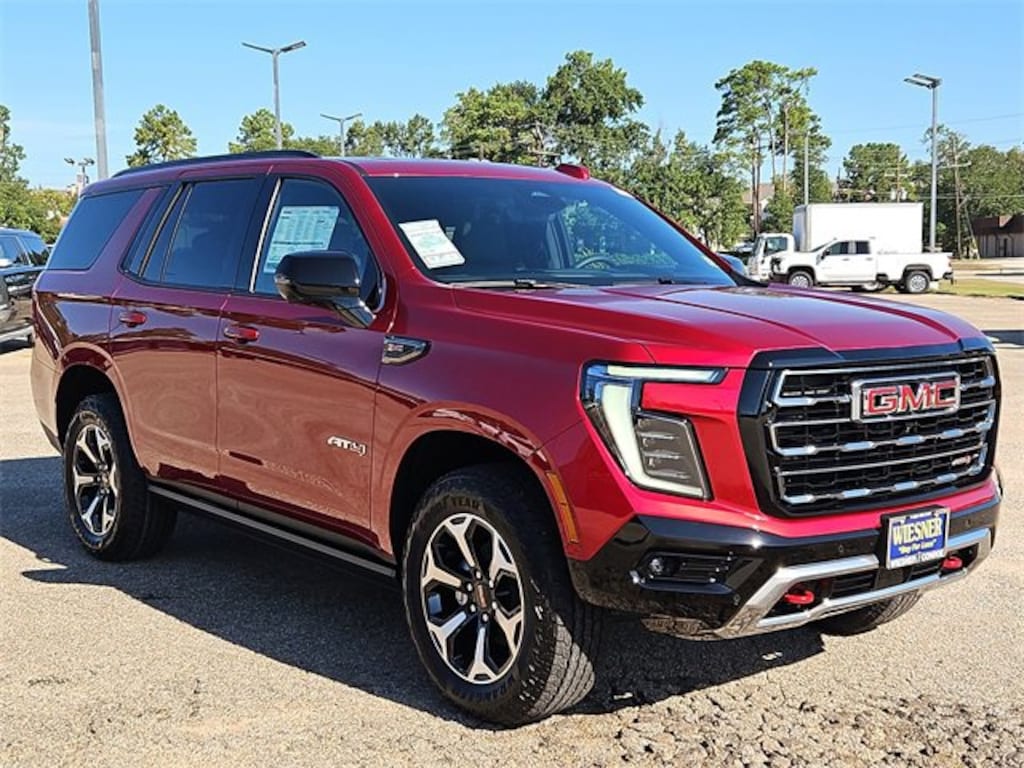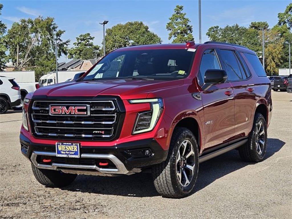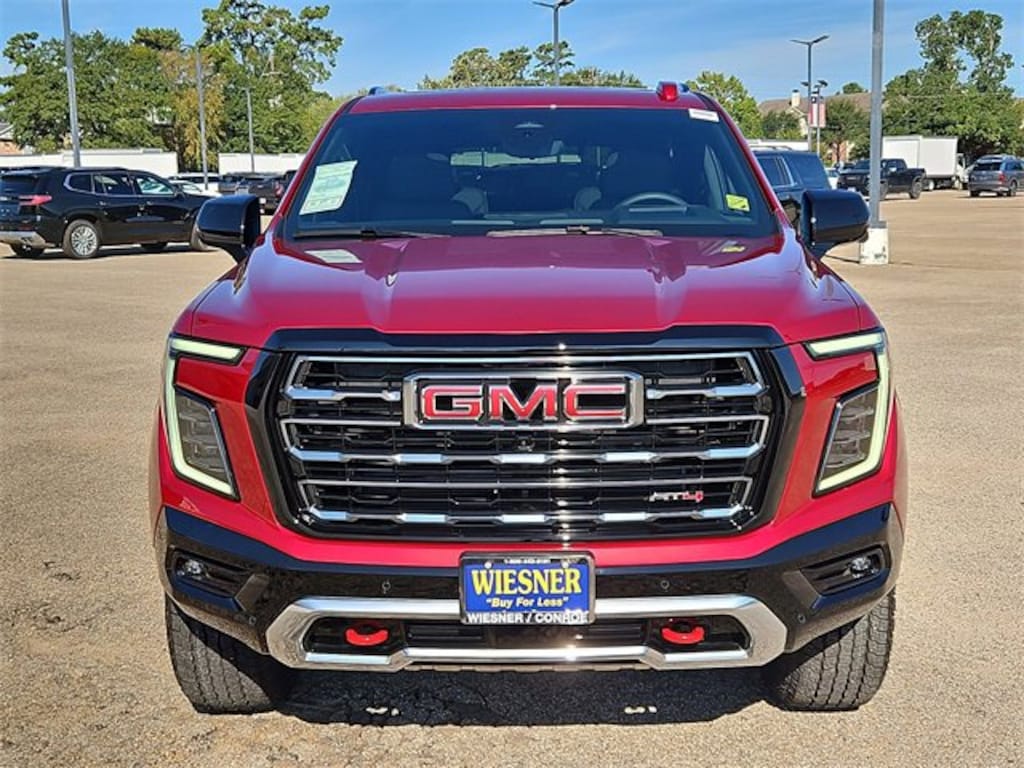 This 2026 GMC Yukon AT4 in Volcanic Red Tintcoat comes with the following features: EcoTec3 6.2L V8 10-Speed Automatic with Overdrive 4WD 4WD Advanced Security Package (Glass Breakage Sensor, Theft-Deterrent Alarm System, Vehicle Inclination Sensor, and Vehicle Interior Movement Sensor), AT4 Premium Package (Dual-Pane Panoramic Power Sunroof and Power-Retractable Assist Steps), License Plate Front Mounting Package, Preferred Equipment Group 4SB (4-Way Power Driver Lumbar Seat Adjuster, 4-Way Power Front Passenger Lumbar Seat Adjuster, AutoSense Hands-Free Power Liftgate, Black Roof-Mounted Luggage Rack Side Rails, Body-Color Door Handles, Bright Front & Rear Door Sill Plates, Dual Exhaust System, Front High-Approach Angle Fascia, Heavy-Duty Air Filter, Hill Descent Control, Perforated Heated & Ventilated Dr & Frt Pass Seats, Power Tilt & Telescopic Steering Column, and Red Horizontal-Mounted Recovery Hooks), Technology Package (15 Diagonal Multi-Color Head-Up Display, Floor Console, Inside Rearview Auto-Dimming Rear Camera Mirror, and Power Release 2nd Row Bucket Seats), 4WD, 10 Speakers, 3.23 Rear Axle Ratio, 3rd row seats: split-bench, 4-Wheel Disc Brakes, ABS brakes, Adaptive suspension, Air Conditioning, Alloy wheels, AM/FM radio: SiriusXM with 360L, Apple CarPlay/Android Auto, Audio memory, Auto High-beam Headlights, Auto-dimming door mirrors, Auto-dimming Rear-View mirror, Auto-leveling suspension, Automatic temperature control, Bose 10-Speaker Surround w/CenterPoint, Brake assist, Bumpers: body-color, Compass, Delay-off headlights, Driver door bin, Driver vanity mirror, Dual front impact airbags, Dual front side impact airbags, Electronic Stability Control, Emergency communication system: OnStar and GMC connected services capable, Exterior Parking Camera Rear, Four wheel independent suspension, Front anti-roll bar, Front Bucket Seats, Front Center Armrest, Front dual zone A/C, Front fog lights, Front reading lights, Fully automatic headlights, Garage door transmitter, Heated door mirrors, Heated Driver & Front Passenger Seats, Heated front seats, Heated rear seats, Heated steering wheel, Illuminated entry, Low tire pressure warning, Magnetic Ride Control Suspension, Memory seat, Navigation system: GMC Connected Navigation, Occupant sensing airbag, Outside temperature display, Overhead airbag, Overhead console, Panic alarm, Passenger door bin, Passenger vanity mirror, Perforated Leather Seating Surfaces, Power door mirrors, Power driver seat, Power Liftgate, Power passenger seat, Power steering, Power windows, Radio: 16.8 Diagonal Premium GMC Infotainment Sys, Rain sensing wipers, Rear air conditioning, Rear anti-roll bar, Rear reading lights, Rear seat center armrest, Rear window defroster, Rear window wiper, Remote keyless entry, Security system, SiriusXM w/360L, Speed control, Speed-sensing steering, Split folding rear seat, Spoiler, Steering wheel memory, Steering wheel mounted audio controls, Tachometer, Telescoping steering wheel, Tilt steering wheel, Traction control, Trip computer, Turn signal indicator mirrors, Variably intermittent wipers, Ventilated front seats, Voltmeter, and Wheels: 20 x 9 Machined & Painted.