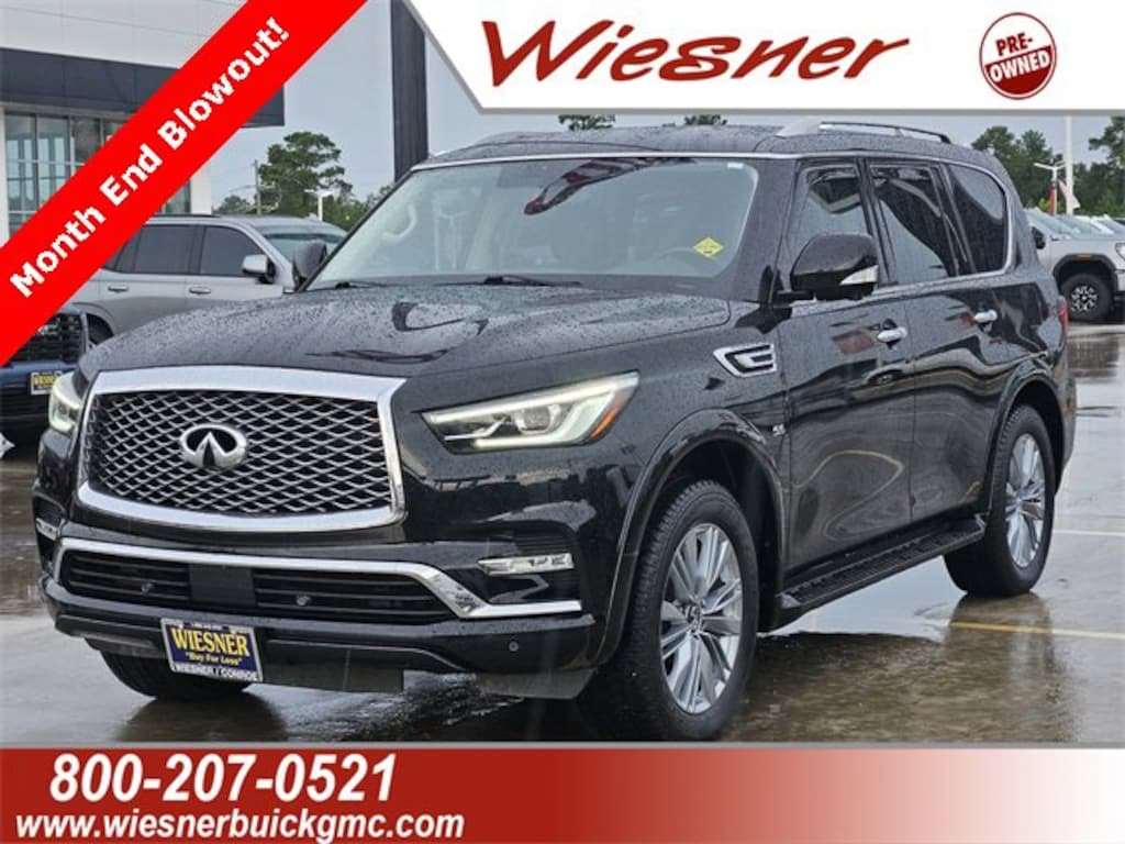 Black Obsidian 2018 INFINITI QX80 RWD 7-Speed Automatic 5.6L V8 13 Speakers, 2.94 Axle Ratio, 3rd row seats: split-bench, 4-Wheel Disc Brakes, ABS brakes, Air Conditioning, AM/FM radio: SiriusXM, Anti-whiplash front head restraints, Auto High-beam Headlights, Auto tilt-away steering wheel, Auto-dimming door mirrors, Auto-dimming Rear-View mirror, Auto-leveling suspension, Automatic temperature control, Bose Cabin Surround Sound System, Brake assist, Bumpers: body-color, CD player, Delay-off headlights, Dual front impact airbags, Dual front side impact airbags, Electronic Stability Control, Emergency communication system: INFINITI Connection, Four wheel independent suspension, Front Bucket Seats, Front Center Armrest, Front dual zone A/C, Front fog lights, Fully automatic headlights, Heated door mirrors, Heated Front Bucket Seats, Heated front seats, Leather Shift Knob, Leather steering wheel, Leather-Appointed Seats w/Stratford Burl Trim, Low tire pressure warning, Memory seat, Navigation System, Occupant sensing airbag, Outside temperature display, Panic alarm, Power door mirrors, Power driver seat, Power Liftgate, Power passenger seat, Power steering, Power windows, Radio data system, Radio: AM/FM/HD Single In-Dash CD/DVD Player w/MP3, Rain sensing wipers, Rear air conditioning, Rear audio controls, Rear window defroster, Rear window wiper, Reclining 3rd row seat, Remote keyless entry, Security system, Speed control, Speed-sensing steering, Split folding rear seat, Steering wheel memory, Steering wheel mounted audio controls, Traction control, Turn signal indicator mirrors, Variably intermittent wipers, Wheels: 20 x 8.0 Split 6-Spoke Aluminum-Alloy.Since 1972 Wiesner has been a name people around Houston and Conroe have trusted for great sales and service. Past Chairman of the Board and CEO John Wiesner was born in Richmond, Texas and grew up in Hempstead. He married Beth Sorsby, also of Hempstead. They were graduates of Southern Methodist University. Mr. Wiesner started his automotive career in Hempstead in 1949, then moved to Baytown. In 1977, he purchased the Buick-Pontiac-GMC dealership in Conroe which is now the main headquarters for the Wiesner Automotive Group. Today the Wiesner Family carries on the tradition started by their father and grand-father by maintaining that great level of trust through community involvement, promoting quality brands and standing behind the motto Buy for Less at Wiesner.Awards:* 2018 KBB.com 5-Year Cost to Own Awards
