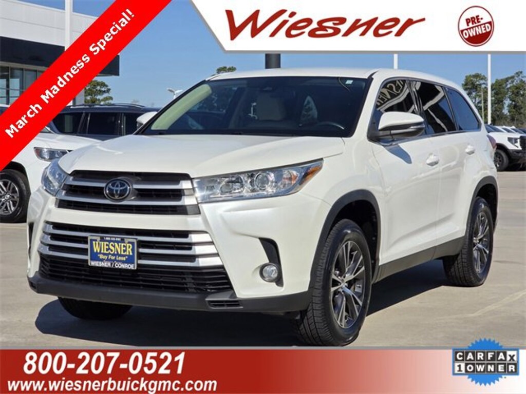 Recent Arrival! CARFAX One-Owner. Clean CARFAX. Blizzard Pearl 2019 Toyota Highlander LE FWD 8-Speed Automatic Electronic with ECT-i 3.5L V6 3.003 Axle Ratio, 3rd row seats: split-bench, 4-Wheel Disc Brakes, 6 Speakers, ABS brakes, Air Conditioning, Auto High-beam Headlights, Brake assist, Delay-off headlights, Driver door bin, Driver vanity mirror, Dual front impact airbags, Dual front side impact airbags, Electronic Stability Control, Exterior Parking Camera Rear, Four wheel independent suspension, Front Bucket Seats, Front Center Armrest, Fully automatic headlights, Heated door mirrors, Low tire pressure warning, Occupant sensing airbag, Panic alarm, Passenger vanity mirror, Power steering, Power windows, Rear air conditioning, Rear window defroster, Reclining 3rd row seat, Remote keyless entry, Speed control, Speed-sensing steering, Split folding rear seat, Steering wheel mounted audio controls, Traction control, Turn signal indicator mirrors, Wheels: 18 Split 5-Spoke Machined-Face Alloy.Since 1972 Wiesner has been a name people around Houston and Conroe have trusted for great sales and service. Past Chairman of the Board and CEO John Wiesner was born in Richmond, Texas and grew up in Hempstead. He married Beth Sorsby, also of Hempstead. They were graduates of Southern Methodist University. Mr. Wiesner started his automotive career in Hempstead in 1949, then moved to Baytown. In 1977, he purchased the Buick-Pontiac-GMC dealership in Conroe which is now the main headquarters for the Wiesner Automotive Group. Today the Wiesner Family carries on the tradition started by their father and grand-father by maintaining that great level of trust through community involvement, promoting quality brands and standing behind the motto Buy for Less at Wiesner.Awards:* 2019 KBB.com Best Resale Value Awards * 2019 KBB.com 12 Best Family Cars * 2019 KBB.com Brand Image Awards